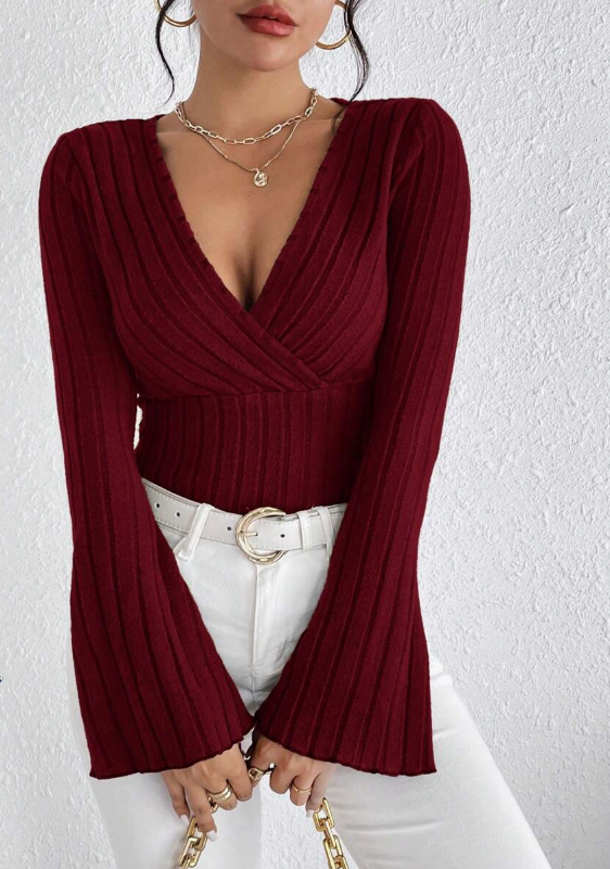 Verleihe deinem Alltagsstil eine elegante Note mit dem Lara Gerippten Strick-Oberteil – einem schicken und raffinierten Essential für jede Garderobe. Das Design besticht durch einen schmeichelhaften Wickel-V-Ausschnitt, der deine Silhouette stilvoll betont. Der weiche, gerippte Strickstoff schmiegt sich perfekt an deinen Körper und sorgt für eine elegante und schlanke Passform. Das figurbetonte Oberteil hebt deine Kurven hervor, während die ausgestellten Glockenärmel einen Hauch von femininer Eleganz verleihen – für einen raffinierten, aber dennoch trendigen Look.